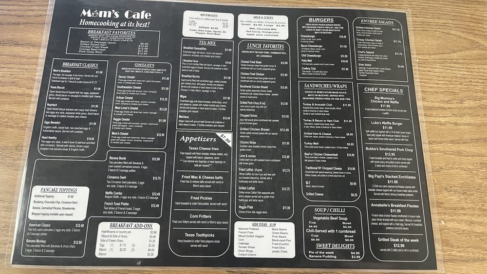 Mom's Cafe in Carrollton, TX, is a charming spot offering a delightful mix of breakfast, brunch, and sandwich options. With a range of amenities like outdoor seating, Wi-Fi, and even dog-friendly spaces, this café caters to a diverse crowd. From Chef Specials like the Big Mommas Chicken and Waffle to country-style specialties like Chicken Fried Steak, Mom's Cafe promises flavorful dishes served in a cozy atmosphere. Appetizers like Texas Cheese Fries and Fried Pickles add a fun twist to the meal. Customer reviews praise the friendly service and tasty food, making Mom's Cafe a go-to spot for a satisfying meal. Whether you're looking for a hearty breakfast or a leisurely brunch, Mom's Cafe is sure to become a favorite dining destination.